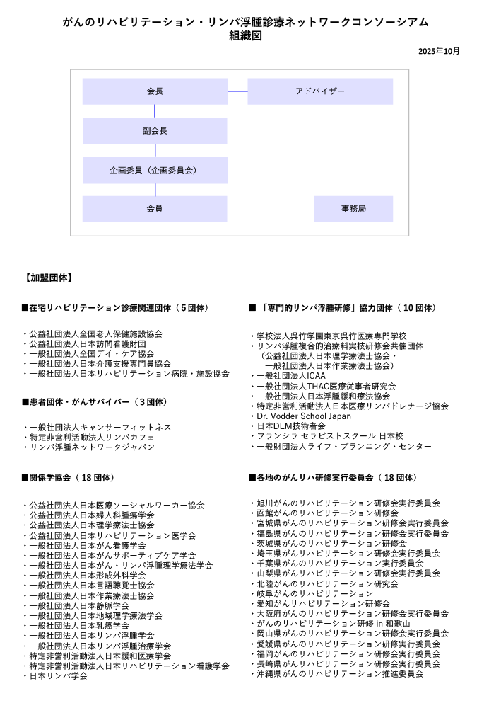 本コンソーシアムは、がんリハビリテーションやリンパ浮腫診療に関わるすべての団体(研修協力団体、地域関連団体、患者団体等)が一堂に会し、各団体の取り組み状況や課題を共有しながら、協働してプロジェクトを推進するためのプラットフォームとして設立されました。